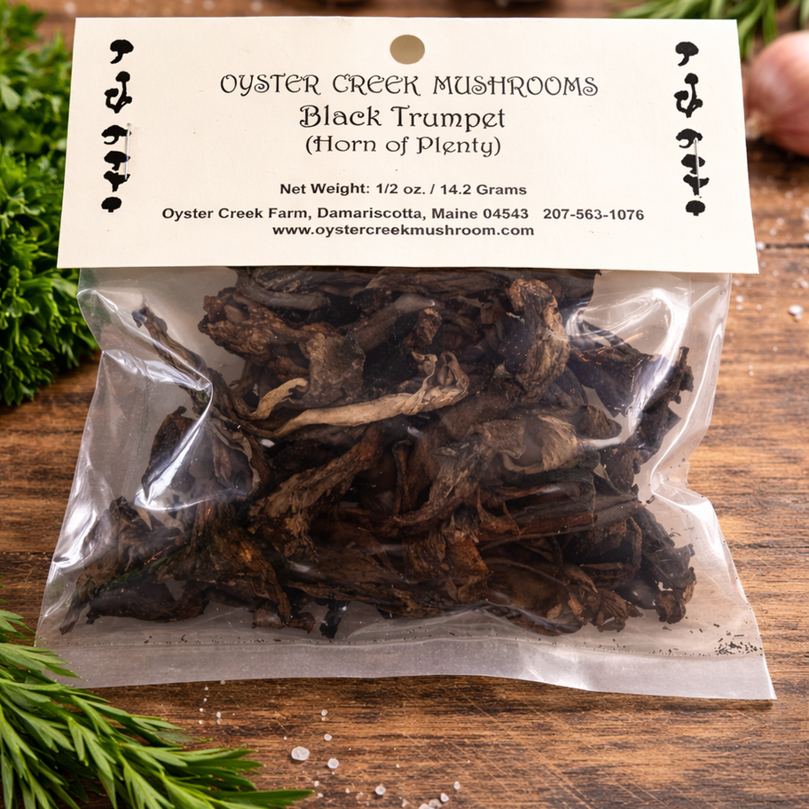 Discover the rich, smoky flavor of Black Trumpet Mushrooms, also known as Horn of Plenty — one of the most prized wild mushrooms among chefs and foragers. At Oyster Creek Mushroom Company in Damariscotta, Maine, we’ve been growing and supplying premium fresh and dried mushrooms since 1989.